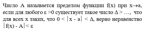 Число A называется пределом функции f(х) при x⟶a, если для любого ε >0 существует такое число Δ > …, что для всех x таких, что 0 < |х - а| < Δ, верно неравенство |f(x) - A| < ε