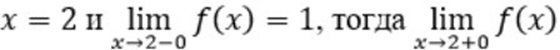 Если известно, что функция f(x) имеет устранимый разрыв в точке x = 2 и lim f(x) = 1, x⟶2−0, тогда lim f(x), x⟶2+0 равен …