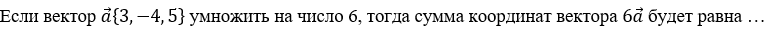 Если вектор a{3, -4, 5} умножить на число 6, тогда сумма координат вектора 6a будет равна ...