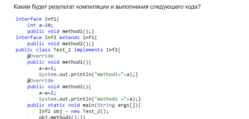 | Ошибка компиляции, т.к. нельзя изменить значение переменной a, все поля в интерфейсах объявлены по умолчанию final. | | |