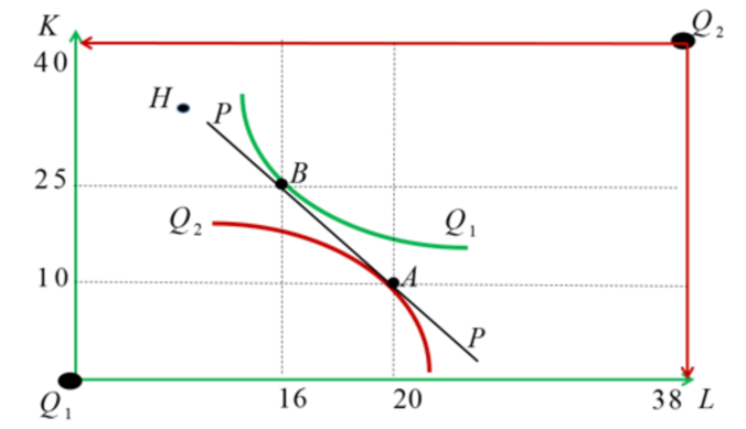 Шаги для понимания данного явления:Таким образом, касание линии относительных цен изоквант в точках А и В указывает на наличие общего равновесия при рассмотрении проблемы эффективности в производстве. Это состояние является желаемым, так как при нем ресурсы используются наиболее эффективно, и производитель достигает максимального выпуска продукции при заданных затратах.