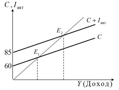 В точке E2 автономные инвестиции будут равны … ден. ед., а равновесный доход составит … ден. ед.