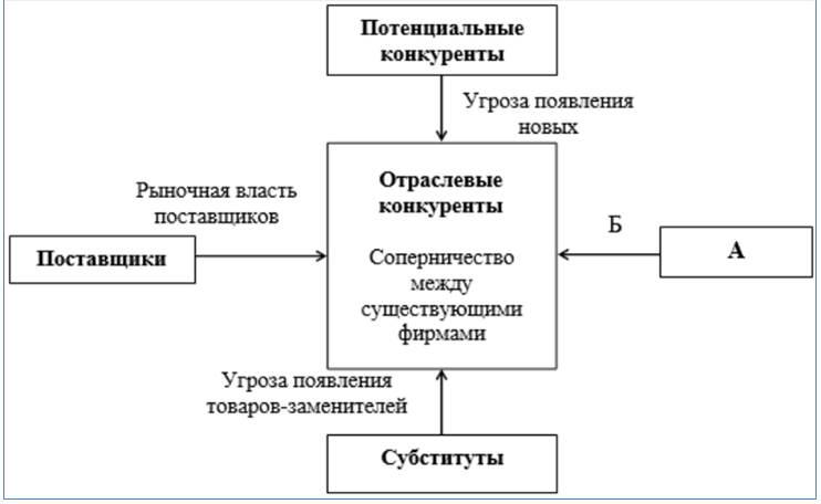 Для того чтобы определить, какая конкурентная сила обозначена буквой «А» и какое влияние обозначено буквой «Б» в схеме пяти конкурентных сил по М. Портеру, необходимо вспомнить, какие именно силы входят в эту модель.