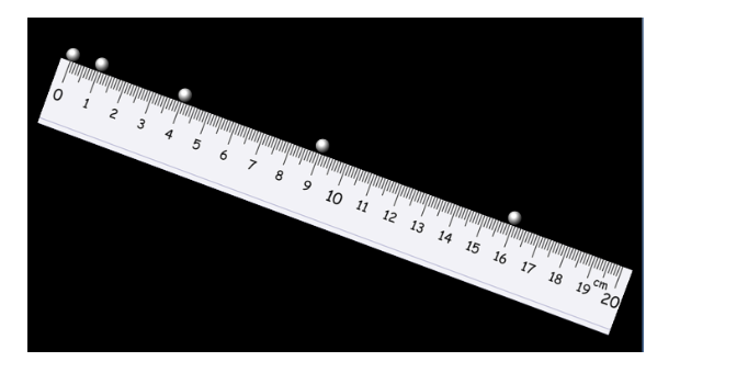 На рисунке приведена стробоскопическая фотография движения шарика по жёлобу (без начальной скорости). Известно, что промежуток времени между двумя последовательными вспышками равен 0,2. На шкале указано расстояние в сантиметрах.