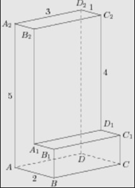 Найдите квадрат расстояния между вершинами D и C1 многогранника, изображенного на рисунке. Все двугранные углы многогранника прямые.
