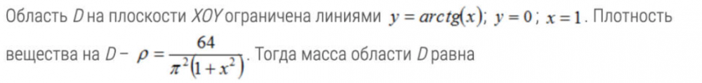 Область D на плоскости XOY ограничена линиями у = arctg(x); y =0; x = 1 . Плотность вещества на D – p = 64/(п2(1+x2). Тогда масса области D равна