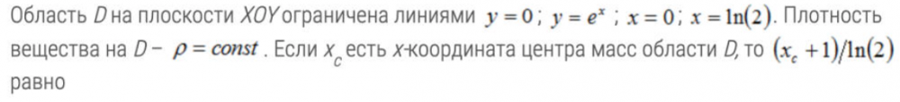 Область Dна плоскости XOYограничена линиями у =0; y = ex ; x = 0; x = ln(2). Плотность вещества на D - p = const . Если х есть x-координата центра масс области D, то (xc+1)/In(2)