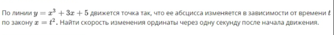 По линии движется точка так, что ее абсцисса изменяется в зависимости от времени t по закону. Найти скорость изменения ординаты через одну секунду после начала движения.