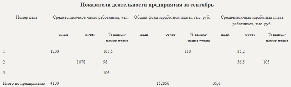 По структурным подразделениям предприятия имеются следующие отчетные данные за сентябрь: