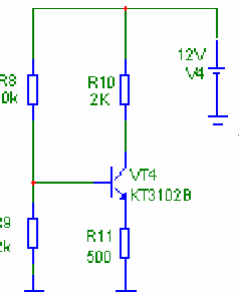 - Эта схема включает резистор, подключенный к эмиттеру транзистора. Он стабилизирует рабочую точку, уменьшая влияние изменений температуры и параметров транзистора.