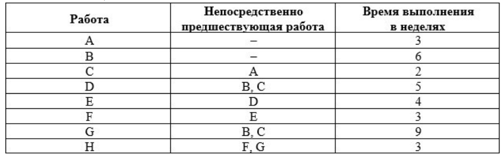 Проект пусконаладки компьютерной системы состоит из восьми работ. Непосредственно предшествующие работы и продолжительность выполнения работ показаны в таблице.