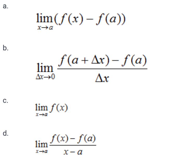 f'(a) = lim (h → 0) (f(a + h) - f(a)) / h