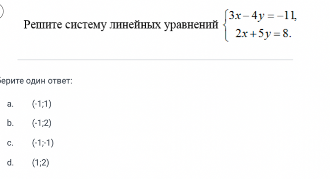 Другие предметы Колледж Системы линейных уравнений Система линейных уравнений решение уравнений математика колледж 3x-4y=-11 2x+5y=8 варианты ответа графическое решение метод подстановки метод исключения координаты точки