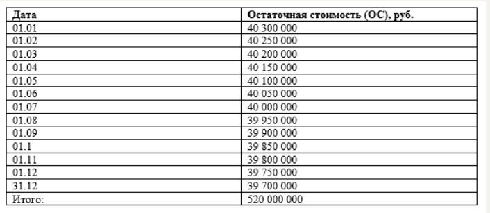 Ставка налога на имущество организаций составляет 2,2 %. В течение года начислены авансовые платежи по налогу на сумму 662 476 руб. Ежемесячная остаточная стоимость представлена в таблице ниже.
