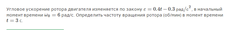 Угловое ускорение ротора двигателя изменяется по закону, в начальный момент времени w = 6 рад/с. Определить частоту вращения ротора (об/мин) в момент времени t = 3 c.