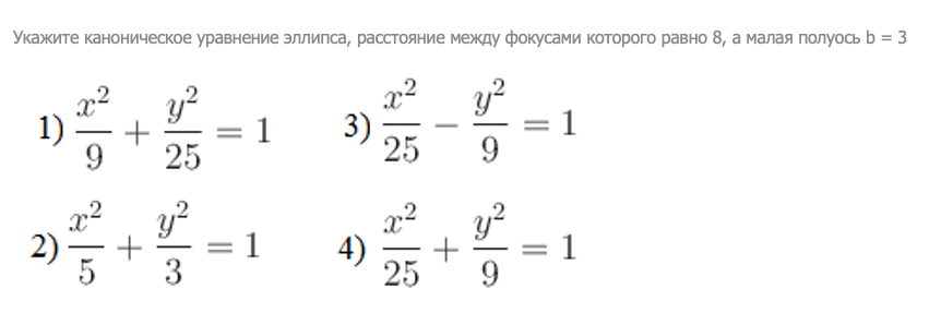 Укажите каноническое уравнение эллипса, расстояние между фокусами которого равно 8, а малая полуось b = 3