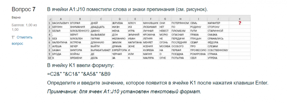Чтобы определить значение, которое появится в ячейке K1 после ввода формулы =C2&" "&C1&" "&A5&" "&B9, давайте разберем каждый элемент формулы и выясним, какие значения находятся в указанных ячейках.