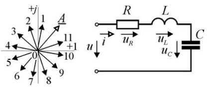 Вектор A соответствует току на этом участке цепи. Укажите ближайшее положение, которое займёт этот вектор при уменьшении частоты питания.