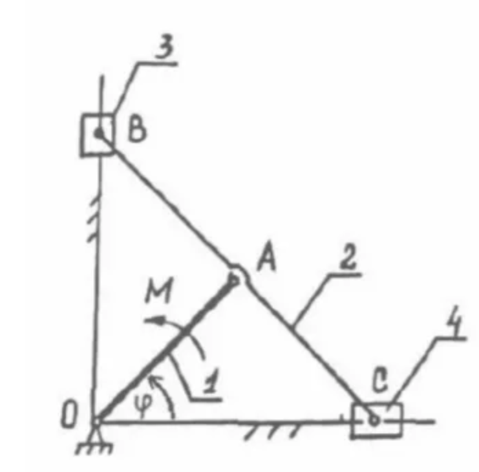 Кривошип 1 и линейку 2 принять за однородные стержни, причем АВ = АС = ОА и масса линейки m2 = 2m1 = 6 кг