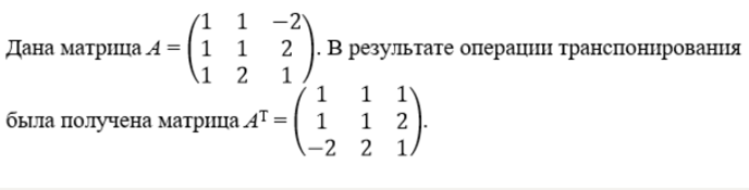 Дана матрица A = ((1, 1, −2), (1, 1, 2), (1, 2, 1)). В результате операции транспонирования была получена матрица Aᵀ = ((1, 1, 1), (1, 1, 2), (−2, 2, 1)).