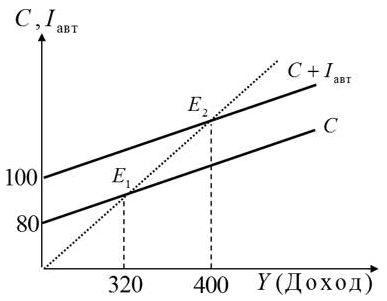 Функция потребления имеет вид: C=Ca+MPC⋅Y. На рисунке представлено равновесие на товарном рынке в модели «Доходы – расходы».