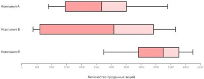 - Наибольший размах у компании Б: Это говорит о том, что разброс значений количества проданных акций у компании Б значительно больше, чем у других компаний. Это может указывать на наличие аномально высоких или низких значений, что требует дальнейшего анализа.