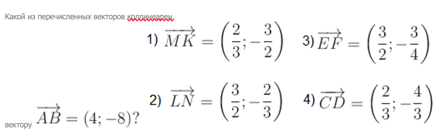 Таким образом, чтобы определить, какой из перечисленных векторов коллинеарен данному вектору, примените вышеописанный метод к каждому из них.