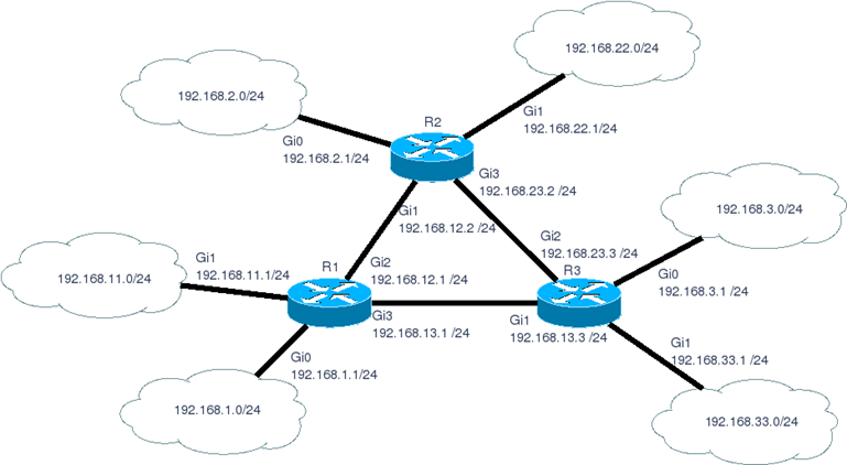 Какую информацию отправит маршрутизатор R1 по протоколу RIP, если у него выйдет из строя интерфейс Gi3?