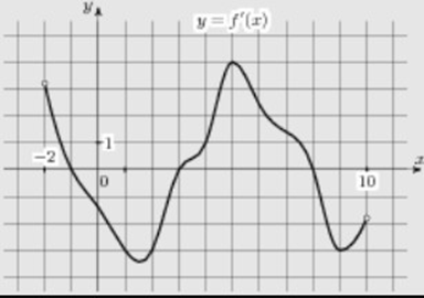 Н а рисунке изображен график y=f`(х) — производной функции f(х), определенной на интервале (-2:10). Найдите количество точек, в которых касательная к графику функции f(х) параллельна прямой y=x-17 или совпадает с ней.