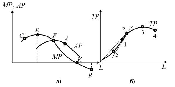 - На графике общего продукта (рисунок б) кривая TP имеет определенные точки, которые показывают, как меняется общий продукт при изменении количества фактора производства.