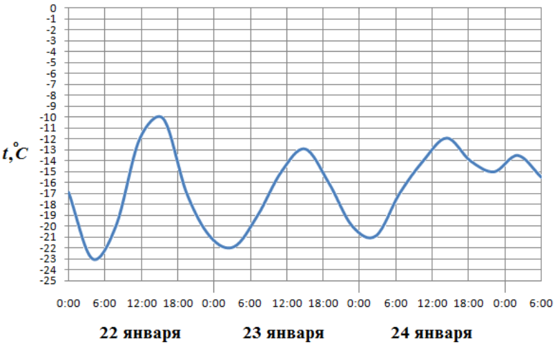 На рисунке показано изменение температуры воздуха на протяжении трех суток. По горизонтали указывается дата и время суток, по вертикали — значение температуры в градусах Цельсия. Определите по рисунку разность между наибольшей и наименьшей температурами воздуха 24 января. Ответ дайте в градусах Цельсия.