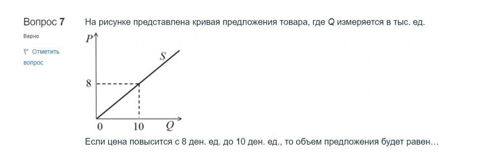 Если вы следовали этим шагам, то вы должны были найти, что при цене 10 денежных единиц объем предложения равен 12,5 тыс. единиц. Таким образом, правильный ответ — 12,5.