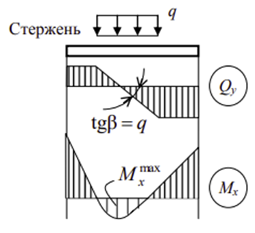 - Изгибающий момент на этом участке будет изменяться по квадратному закону. Это происходит из-за того, что момент, создаваемый распределенной нагрузкой, накапливается по длине стержня, и его величина зависит от расстояния от опоры до рассматриваемой точки.