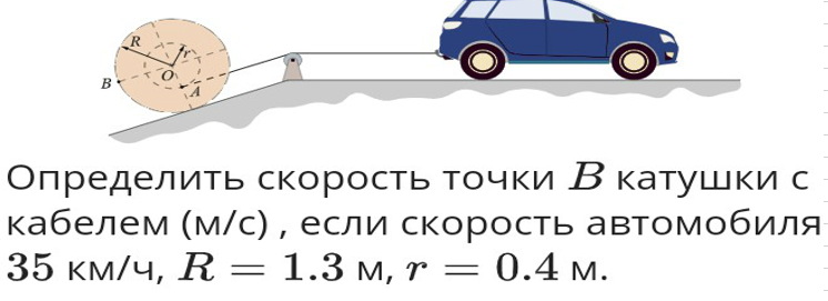 Определить скорость точки В катушки с кабелем (м/с) , если скорость автомобиля 35 км/ч, R = 1.3 м, r = 0.4 м.