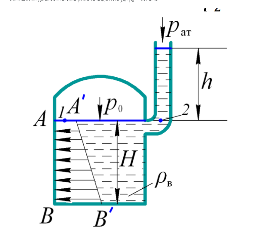 Определить высоту столба воды в пьезометре над уровнем жидкости в закрытом сосуде, если абсолютное давление на поверхности воды в сосуде р0 = 104 кПа.