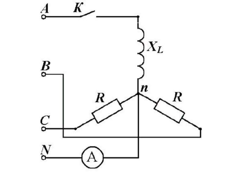 Определите показания прибора в цепи при замкнутом и разомкнутом выключателе, если линейное напряжение Uл=380 В, R=XL=50 Ом ![]()