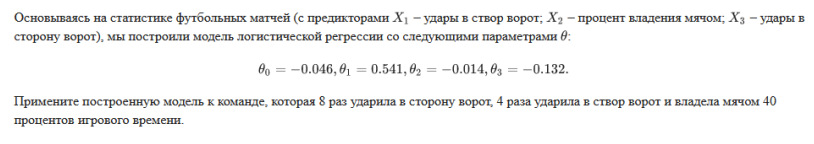Основываясь на статистике футбольных матчей (с предикторами X, - удары в створ ворот; X2 - процент владения мячом; Хз - удары в сторону ворот), мы построили модель логистической регрессии со следующими параметрами
