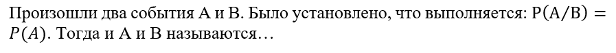 Произошли два события А и В. Было установлено.ю что выполняется: Р(А/В)=Р(А). Тогда и А и В называются...