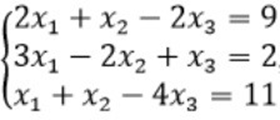 Пусть дана система уравнений A = {2x₁ + x₂ − 2x₃ = 9, 3x₁ − 2x₂ + x₃ = 2, x₁ + x₂ − 4x₃ = 11, тогда определитель |A| этой системы равен