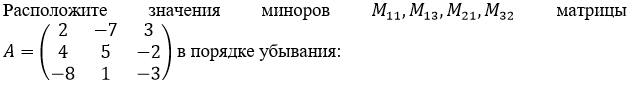 Расположите значения миноров М11, М13, М21, М32 матрицы А=2 -7 3 4 5 -2 -8 1 -3 в порядке убывания