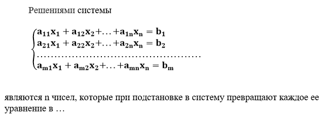 Решениями системы <...> являются n чисел, которые при подстановке в систему превращают каждое ее уравнение в …