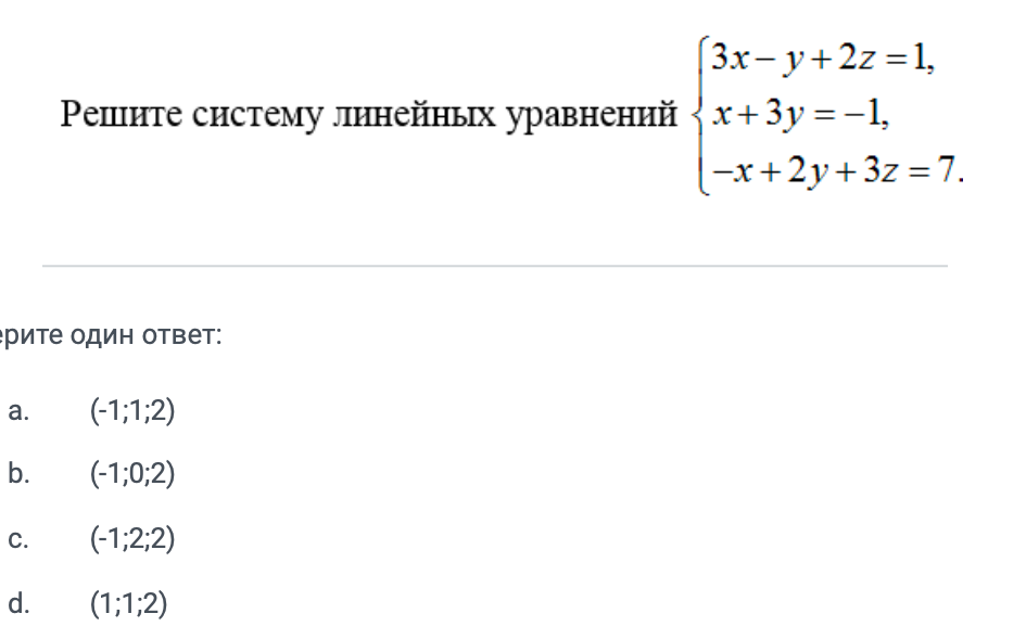 Итак, решение системы уравнений: (-1; 0; 2). Это соответствует одному из предложенных вариантов ответа.