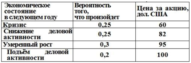 Таблица, приведенная ниже, содержит данные о стоимости акций Charleston Corporation в различных экономических ситуациях: Рассчитанная средняя стоимость акций равна …
