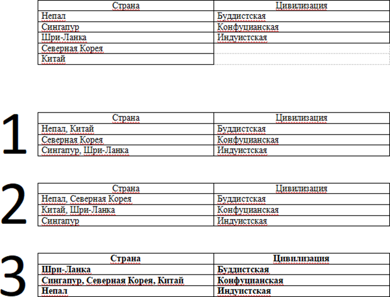 Вам предложили провести совместную исследовательскую деятельность с аспирантом N по теме «Восточные модели государственного управления». Одной из задач для Вас стало грамотное распределение стран по цивилизациям, к которым они относятся. У Вас на руках такие неотработанные данные: