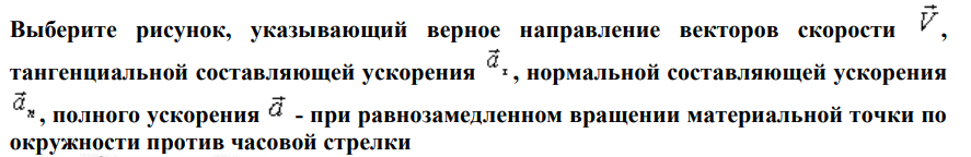 Выберите рисунок, указывающий верное направление векторов скорости, тангенциальной составляющей ускорения, нормальной составляющей ускорения, полного ускорения - при равнозамедленном вращении материальной точки по окружности против часовой стрелки