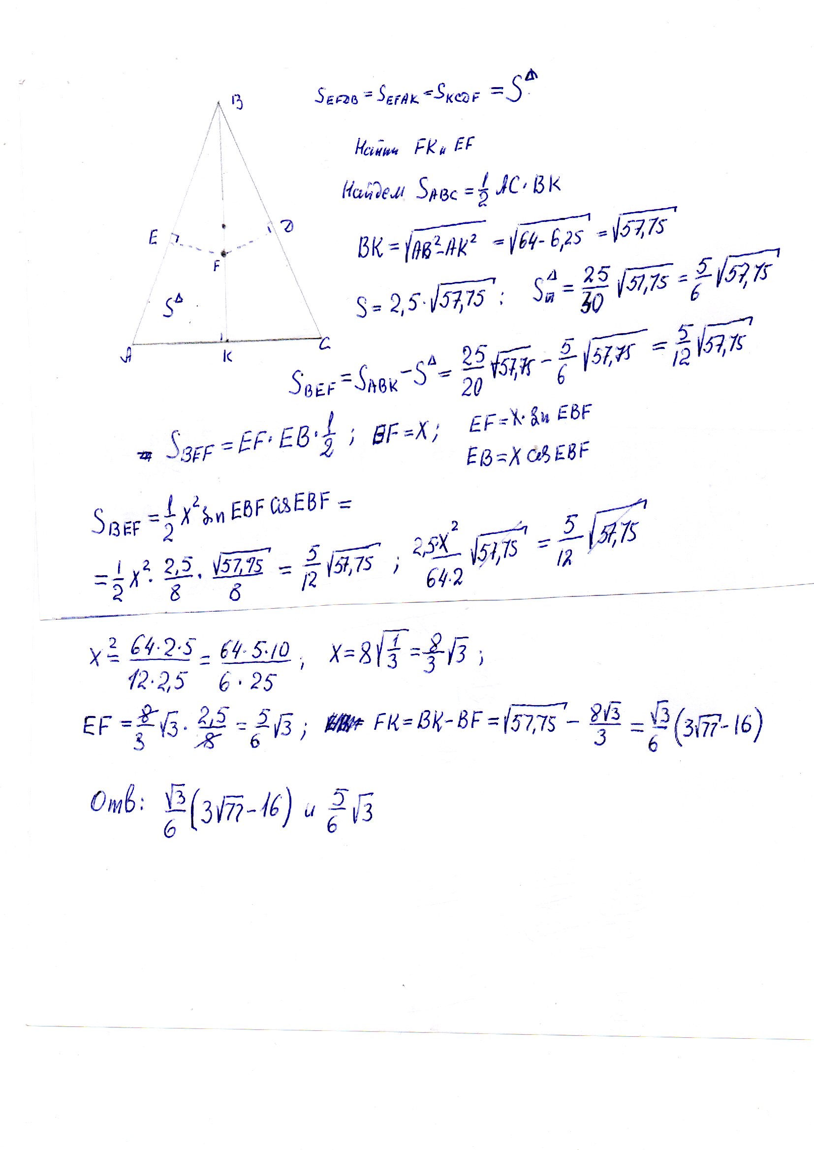 Геометрия 11 класс Параллельные прямые и перпендикуляры в треугольнике равнобедренный треугольник стороны 8 8 5 расстояние до сторон перпендикуляры равновеликие части геометрия 11 класс