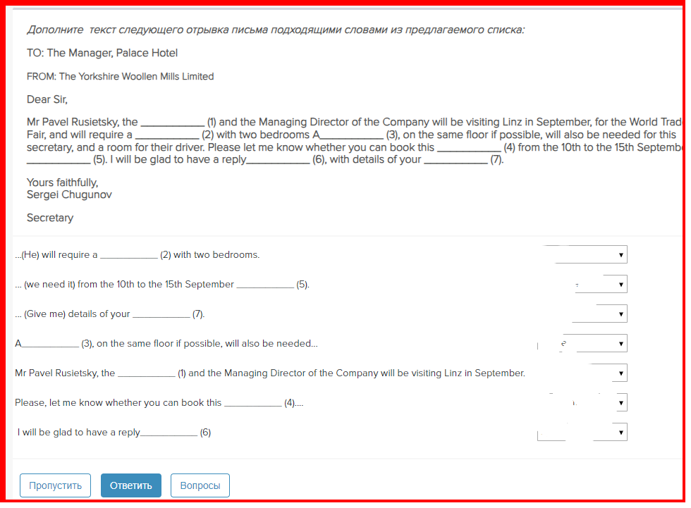 Dear Sir, Mr Pavel Rusietsky, the Managing Director of the Company will be visiting Linz in September, for the World Fair, and will require a suite with two bedrooms. A room for their driver will also be needed for this reservation from the 10th to the 15th September. I will be glad to have a reply. Yours faithfully, Sergei Chugunov Secretary.