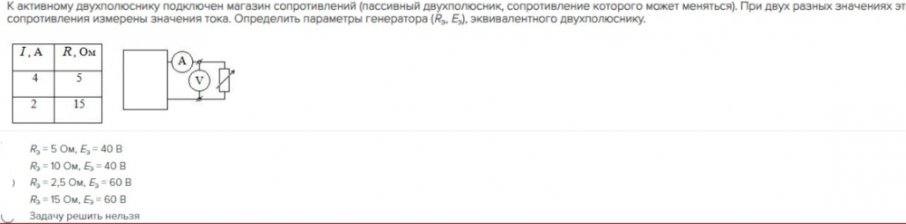 Для решения задачи, связанной с определением параметров эквивалентного генератора двухполюсника, необходимо использовать метод двух измерений. Однако в данном случае предоставленные данные не позволяют однозначно определить параметры генератора. Давайте рассмотрим шаги, которые обычно предпринимаются для решения подобных задач, и почему в данном случае решение невозможно.