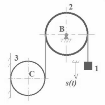 Аналитическая механика: Каток 3 может катиться без проскальзывания по вертикальной стенке. Масса катка 3 вдвое больше массы груза 1, которая равна m. Трос считается нерастяжимым. Чему равна обобщённая сила, если координата s(t) описывает движение груза?