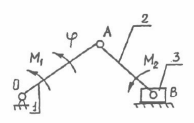 Аналитическая механика: вычислить обобщенную силу в направлении координаты ф для системы, движущейся в горизонтальной плоскости под действием двух моментов М1=200 Нм и М2=50 Нм. Длина стержней ОА=АВ=1 м. Масса стержней: m=10 кг. Масса ползуна mB=2кг.